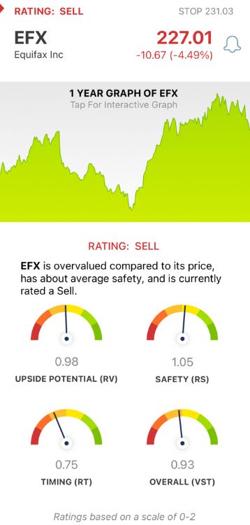Each sits on a scale of 0.00-2.00 with 1.00 being the average, making interpretation quick and easy. You’re even given a clear buy, sell, or hold recommendation based on the overall VST rating for any given stock at any given time. Here’s what we found for EFX: