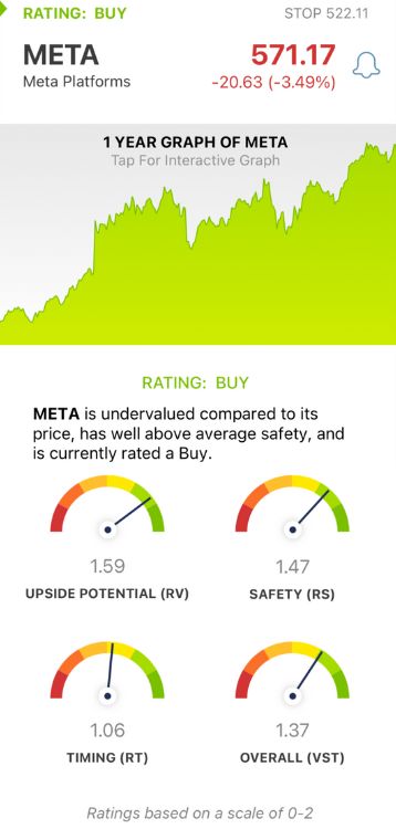 It gets even better, though. You’re offered a buy, sell, or hold recommendation based on the overall VST rating for any given stock at any given time. As for META, here’s what we found: