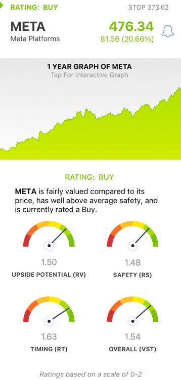 • Excellent Upside Potential: The RV rating is a comparison between a stock’s long-term price appreciation potential (based on a 3-year price projection), AAA corporate bond rates, and risk. It offers much better insight than the typical price-to-value comparison. META has an excellent RV rating of 1.50 right now.