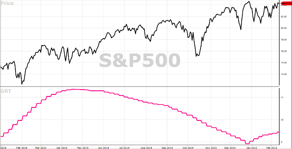 This fall in the Earnings Trend Component to 1.11 is not a serious change. Therefore, our view is that a Bull Market Scenario for the S&P500 will prevail in 2015. However we must watch the Earnings Trend Component very carefully. Profits in the oil industry are expected to drop by 16.5% over the coming year, but we expect profits in the consumer sectors to increase from oil’s decrease.