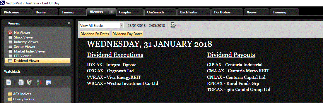 At VectorVest, we keep you informed of any upcoming dividends. To get the latest upcoming dividend dates, click on the Viewers tab on the main toolbar and on the left-hand side click on the heading Dividend Viewer. Note the Dividend Execution dates coming up and Dividend Payout dates. For example, on 31 January, IDX.AX, OZG.AX and WIC.AX all have their dividend execution dates falling due. That means one would need to pick up these stocks before the share market closes on 30 January to be eligible for the dividends (even if you sell your stocks the very next day). I can also see that on 31 January, CIP.AX, CMA.AX, CNI.AX, RFF.AX and TPG.AX all have their dividend payouts taking place. As more dividend execution dates are announced, these will be picked up in the Dividend Viewer.